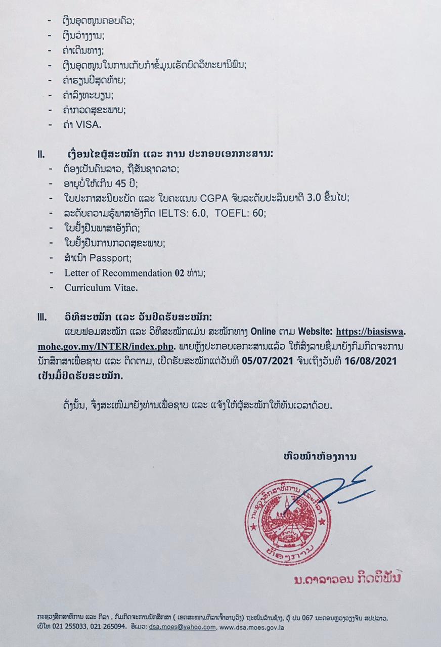 ແຈ້ງທຶນການສຶກສາມາເລເຊຍ 2021-2022